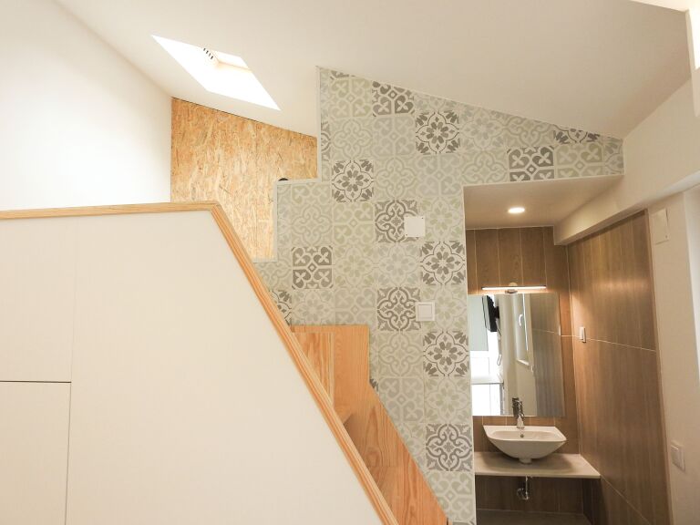 O edifício, composto por seis mini lofts, foi alvo de uma reabilitação cuidadosa que respeitou a traça original, ao mesmo tempo que introduziu soluções modernas e eficientes. A intervenção incluiu a renovação de infraestruturas, melhoria do isolamento térmico e acústico, e a integração de materiais sustentáveis, proporcionando um ambiente confortável e energeticamente eficiente.